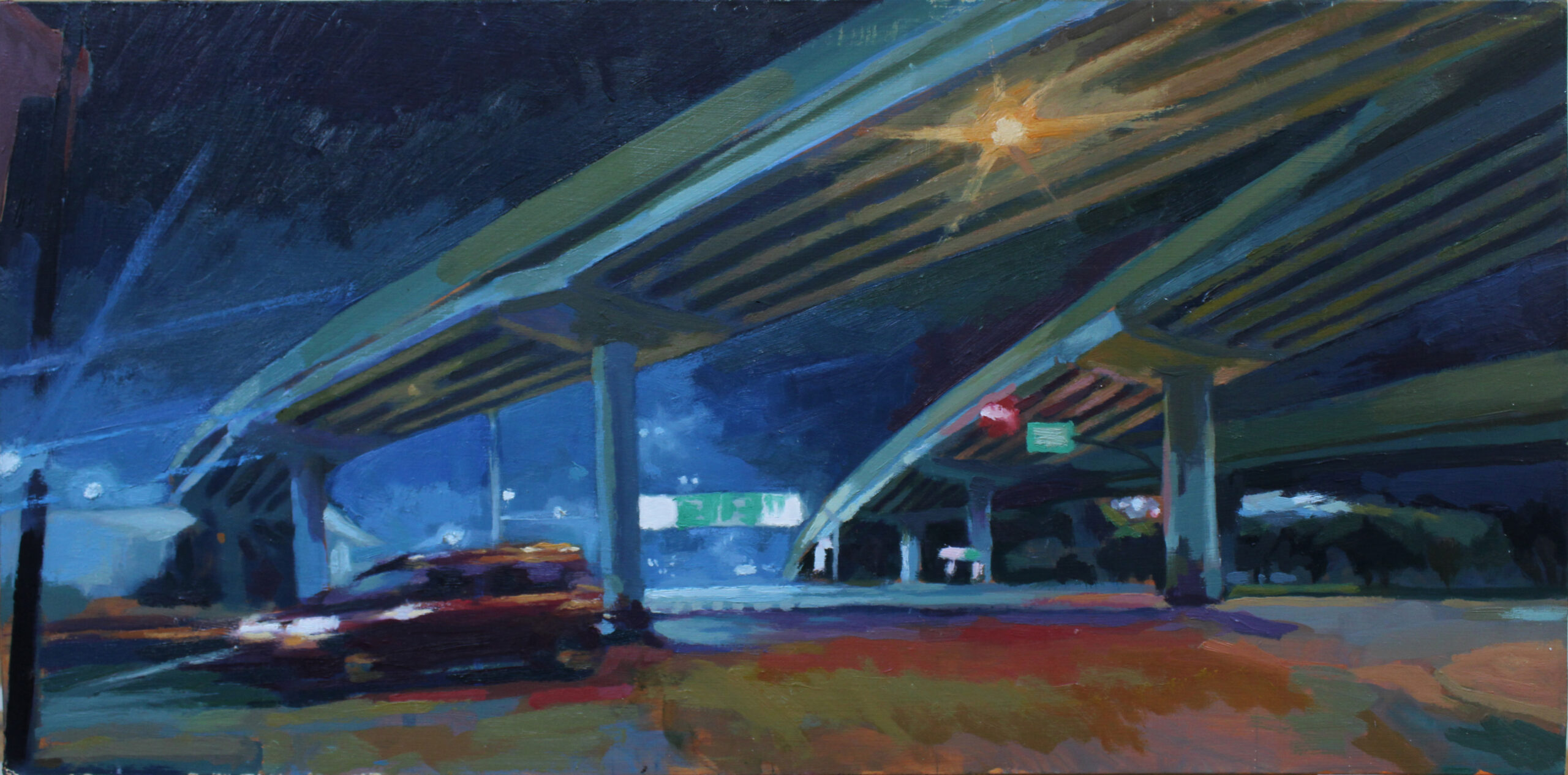 En “El viaje”, el artista Cali Simões despliega una serie de pinturas nacidas del tránsito: de los recorridos cotidianos entre el conurbano bonaerense y la ciudad de Buenos Aires. En ellas, el paisaje urbano y suburbano se vuelve materia poética. Autos detenidos, rutas, estaciones de servicio, neumáticos, calles vacías y cielos encendidos conforman un mapa afectivo de lo que persiste entre lo que avanza y lo que se detiene.