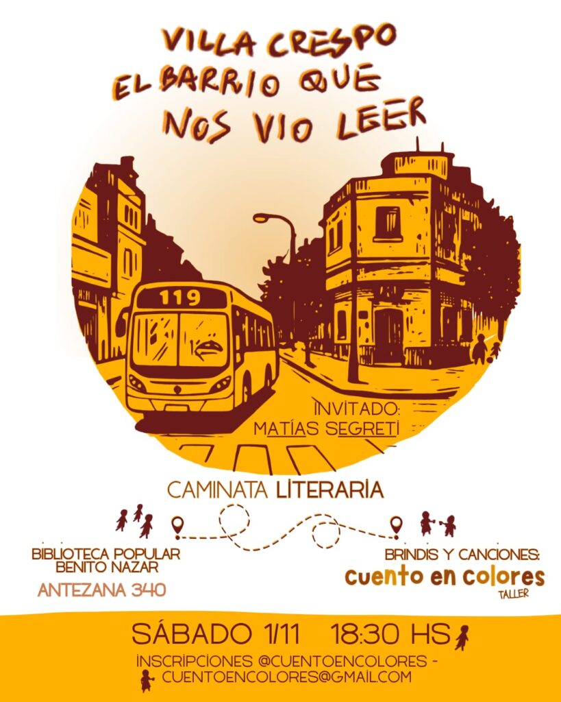 El sábado 1° de noviembre a las 18.30hs se llevará a cabo una propuesta cultural que invita a leer la geografía de Villa Crespo a través de la literatura, curada y guiada por Sofía de Titto en compañía del autor y editor, Matías Segreti, bajo el título «Villa Crespo, el barrio que nos vio leer».
