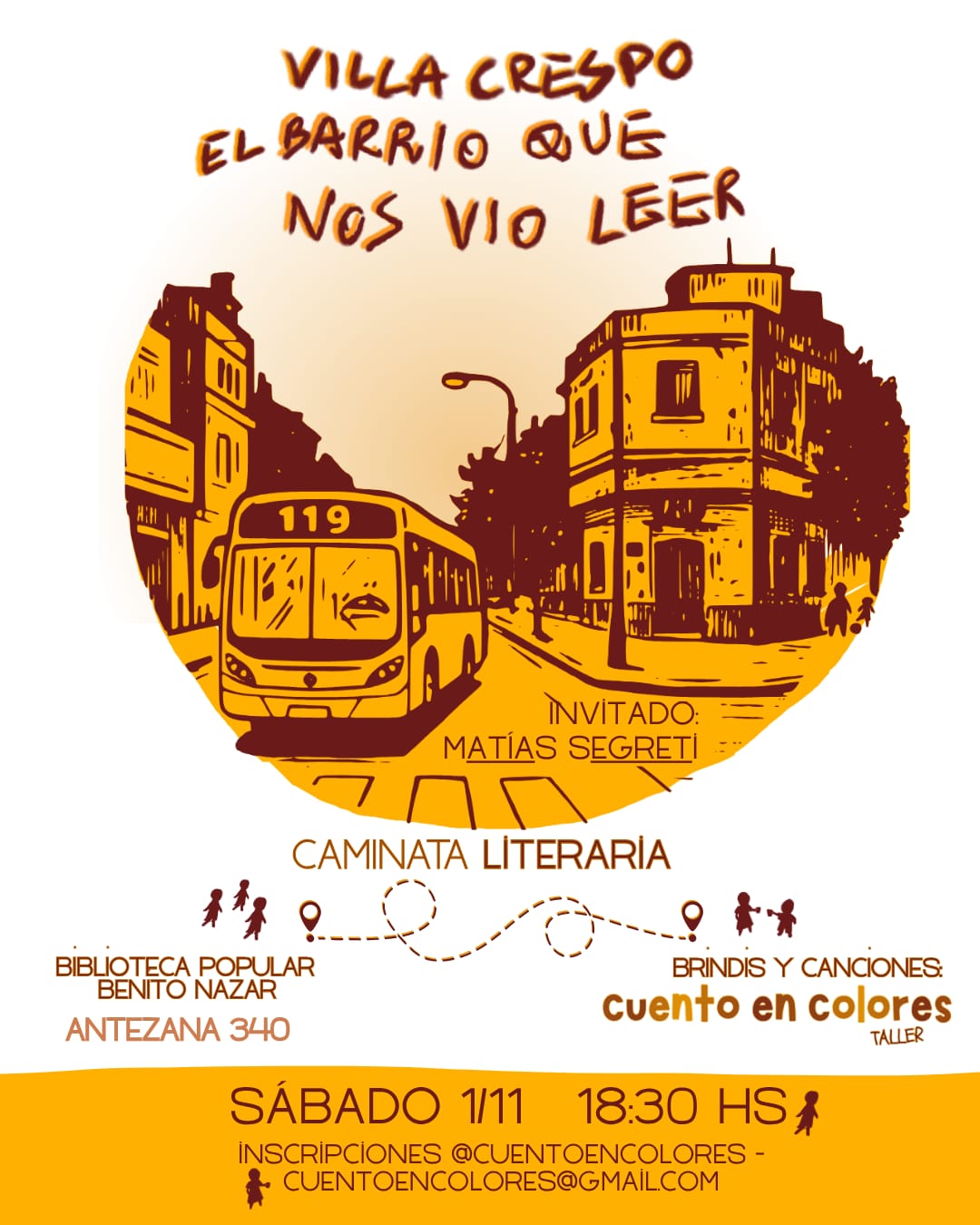 El recorrido parte de la Biblioteca Benito Nazar, Antezana 340 y luego de 90 minutos de caminata por el barrio, termina en Cuento en Colores, Luis Viale 278, con una tertulia, brindis y canciones en vivo.