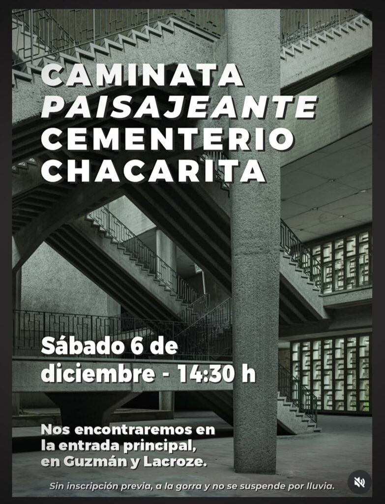 El punto de encuentro será la entrada principal del Cementerio de Chacarita, Guzmán y Federico Lacroze, para paisajear caminando por algunas áreas del cementerio. Se compartirá en grupo miradas, historias, hallazgos, de lo que se vaya encontrando.