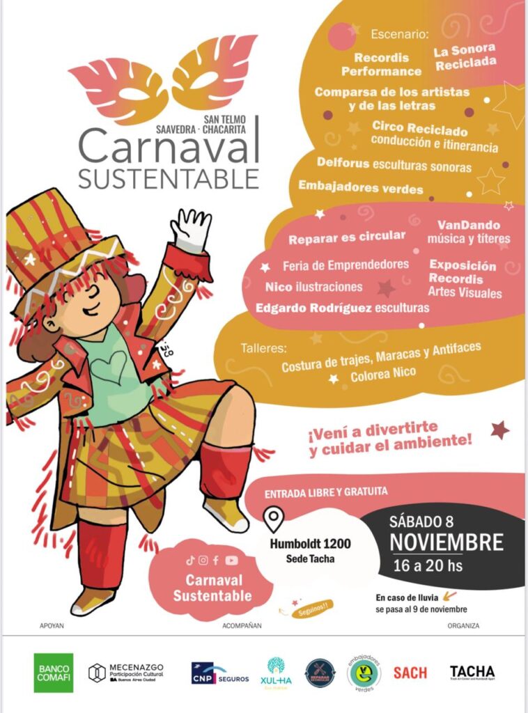 El sábado 8 de noviembre, de 16 a 22hs, llega Carnaval Sustentable a TACHA, Humboldt 1271, en el barrio de Chacarita.