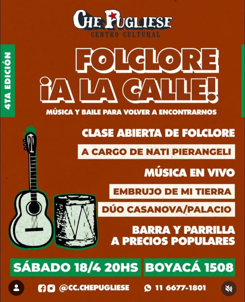El sábado 18 de abril desde las 20hs el Centro Cultural Che Pugliese, Boyacá 1508, en el barrio de Villa General Mitre, realizará la cuarta edición de Folclore a la Calle, música y baile para encontrarse.