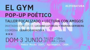 El Gym Pop-up poético consta de un 2×1. Por un lado, es un taller focalizado en el trabajo de un recurso, tema o método de escritura poética. Así como también es una lectura abierta al público en la que participarán los asistentes al taller y autores invitados especialmente para la ocasión.