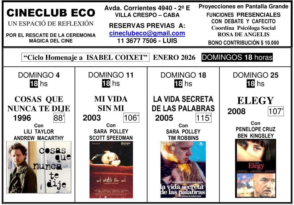El Cineclub Eco invita durante enero a disfrutar de un ciclo dedicado a la directora española Isabel Coixet en Villa Crespo: