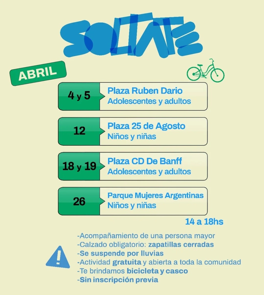 En esta oportunidad, la actividad estará dedicada a niñas y niños de hasta 13 años de edad, los cuales deberán asistir acompañados de un adulto responsable y con zapatillas cerradas de manera obligatoria (no ojotas ni sandalias). No será necesario contar con casco y bicicleta, ya que se brindará uno para practicar, aunque sí se recomienda llevarla si se la tiene, para poder quedar familiarizado con ese rodado.