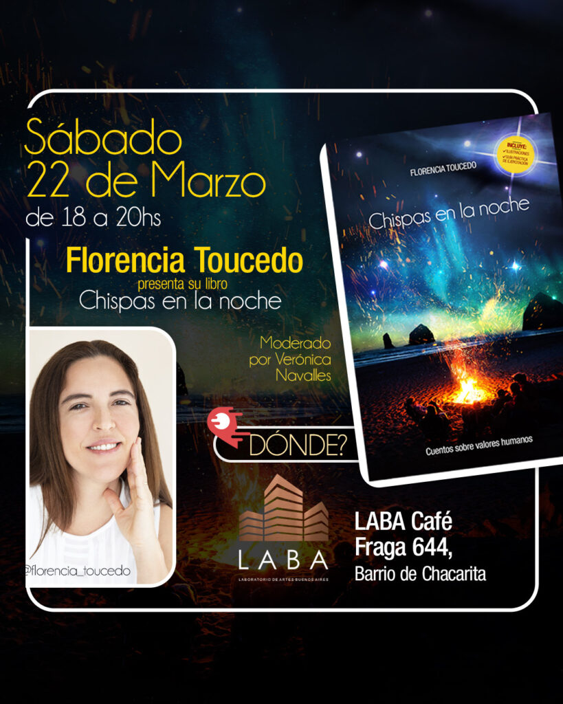 El sábado 22 de marzo a las 18hs se presenta el libro “Chispas en la Noche” de Florencia Toucedo, en Laboratorio de Artes Buenos Aires (LABA), Fraga 644, en el barrio de Chacarita.